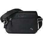- Polyester bag with a zippered top closure and an adjustable crossbody strap.
