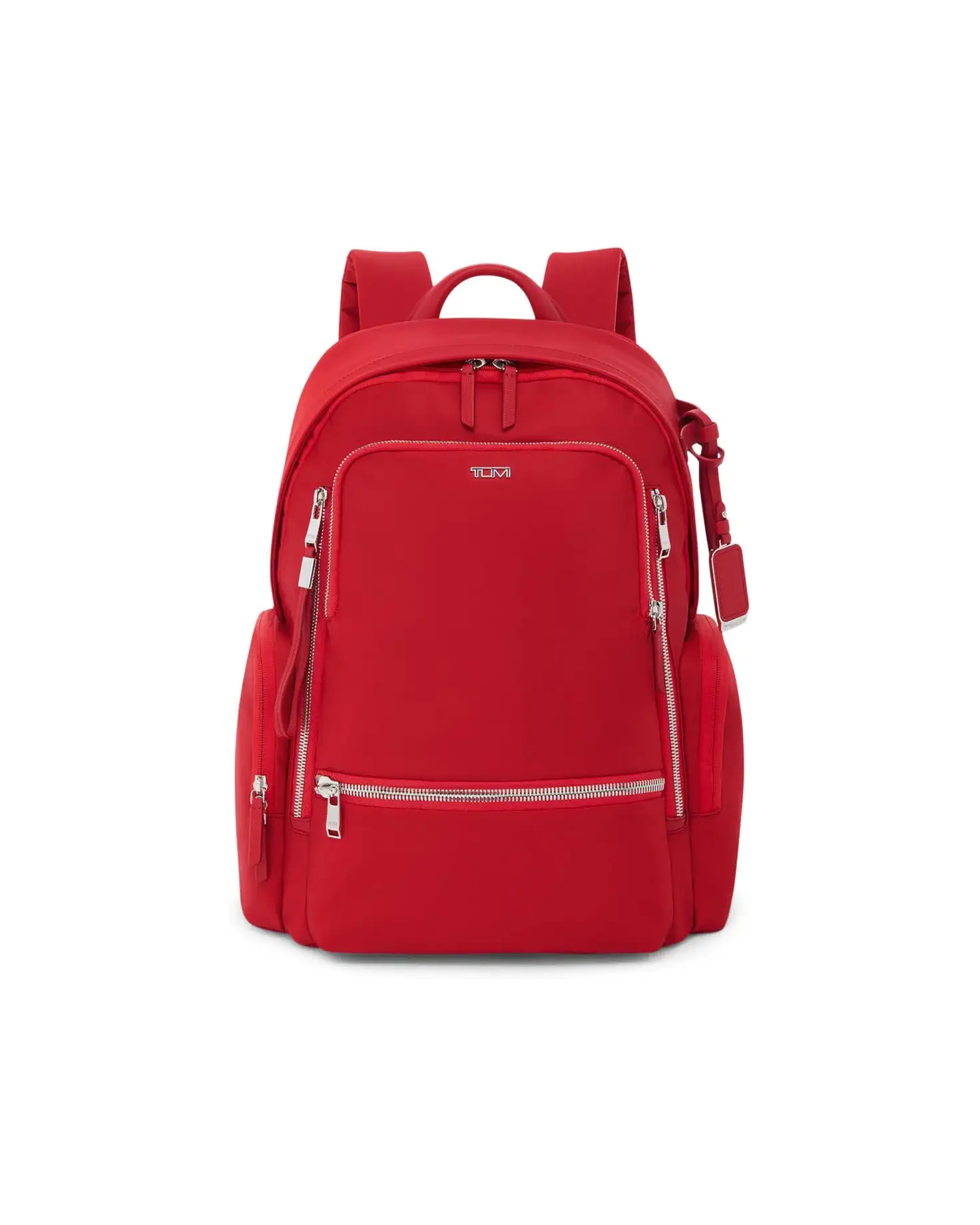 - Travel light and follow your dreams carrying the Tumi® Celina Backpack. Crafted from nylon, this bag features double-zippered entry to main compartment, zippered laptop compartment, leather top handle, U-zippered exterior pocket, two zippered front pockets, zippered front entry to main compartment, zippered side pocket and double-zippered side water-resistant water bottle pocket. It has padded adjustable backpack straps with d-ring & loop compatible with brand accessories, quick-access phone pocket and detachable monogram leather charm. This bag also has zippered interior pocket, tumi tracer®, two interior media pockets and leather card pocket.