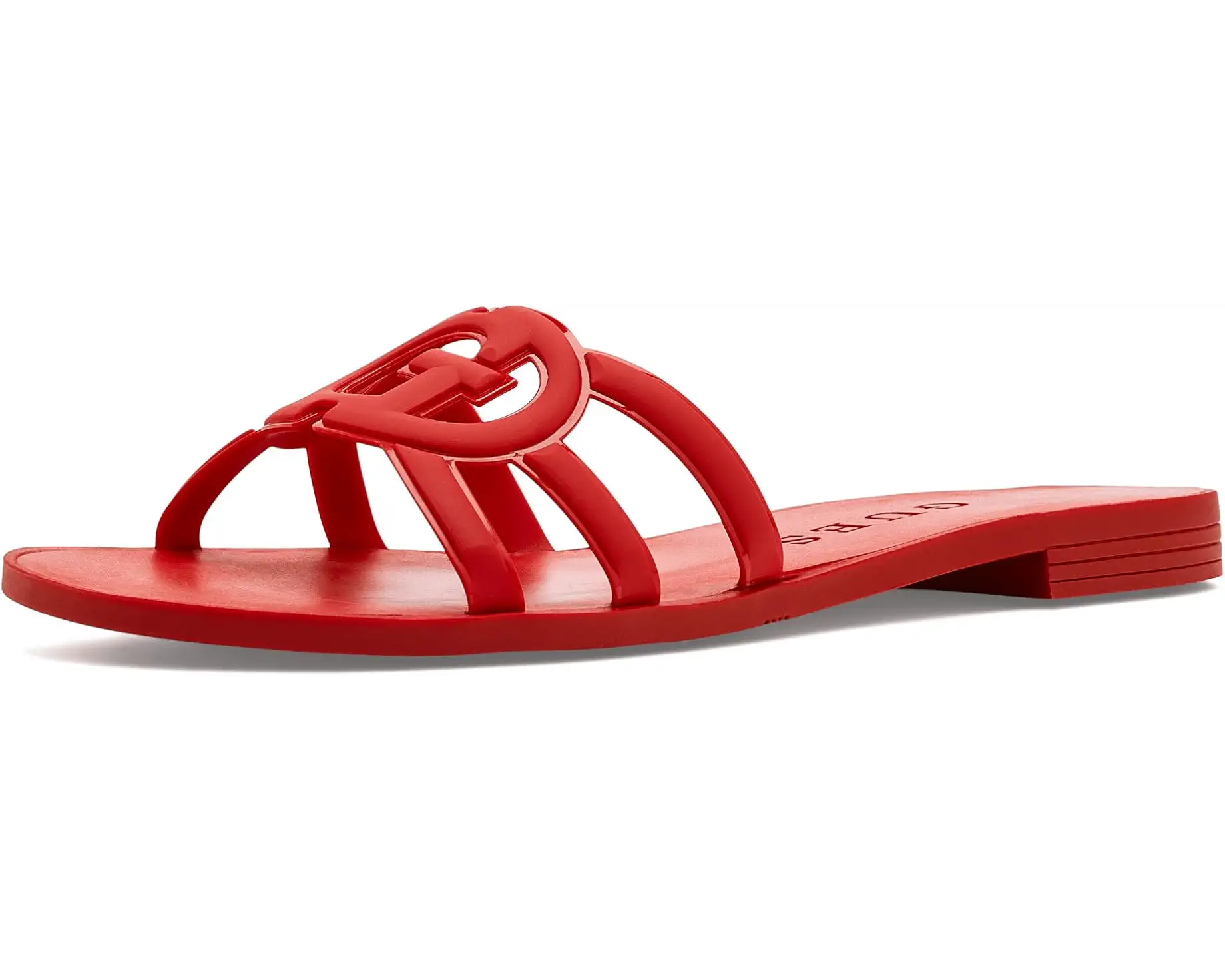 • With Elyho by GUESS®, you're always ready to step out in confidence. Designed for everyday ease, this chic flat features a synthetic rubber upper paired with a durable synthetic rubber outsole that ensures comfort with every stride. The open, round toe gives it a breezy feel, while the slip-on construction makes it quick and convenient to wear wherever life takes you. A glossy PU lining adds subtle polish, and the standout cut-out G logo detail brings that signature GUESS edge.