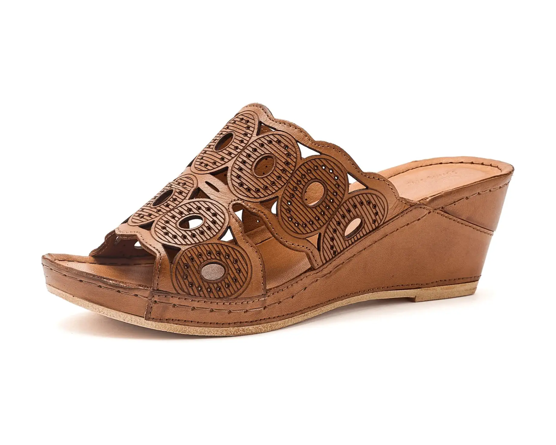 - The Spring Step® Labarnas women's wedge sandals blend bold geometry with everyday sophistication for a contemporary look. Featuring precision laser-cut circles and layered architectural cutouts, these sandals provide eye-catching style and breathability. The smooth leather upper and lining create a luxurious feel against your skin, while a cushioned insole offers superior comfort throughout your day. Designed with a wedge heel, the Labarnas sandals deliver a feminine lift without sacrificing stability or ease. Made in Turkey, they showcase European quality and craftsmanship, making these wedges a versatile choice for weekday chic or weekend leisure. Lightweight and striking, they effortlessly complement your seasonal wardrobe with sophistication and comfort.